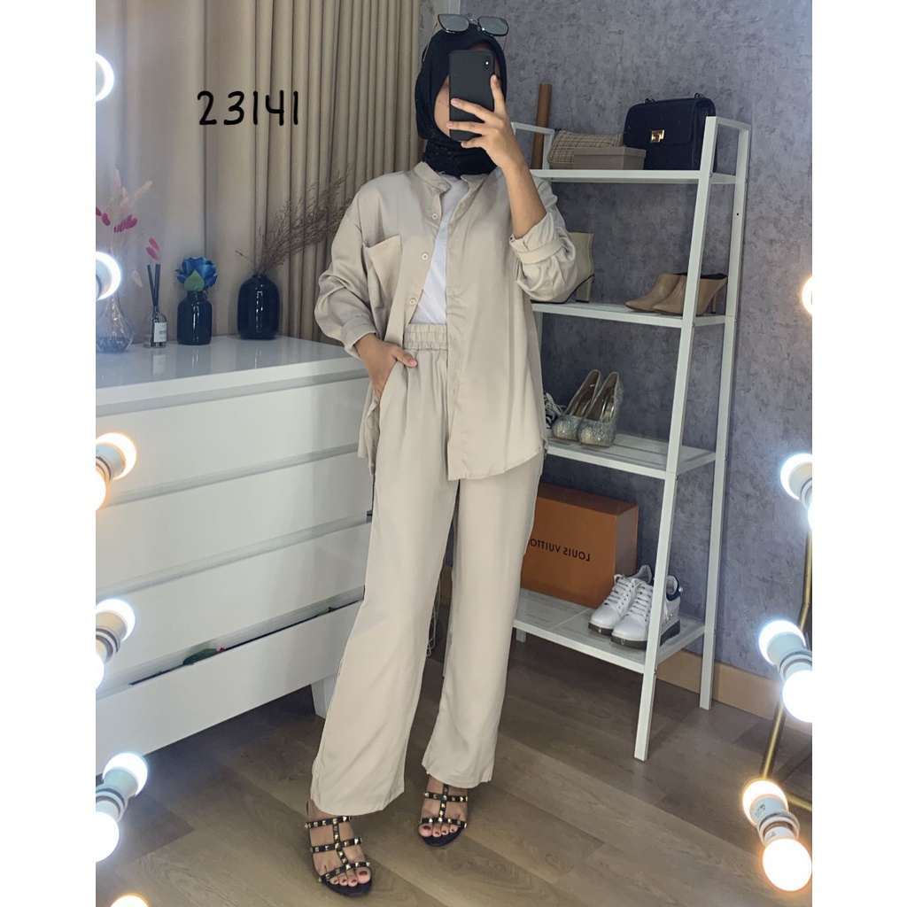 23141 ONE SET BASIC PANJANG POLOS WANITA ATASAN KEMEJA PJ POCKET DEPAN CELANA PINGGANG KARET KELILING FREE TALI SETELAN BASIC WANITA