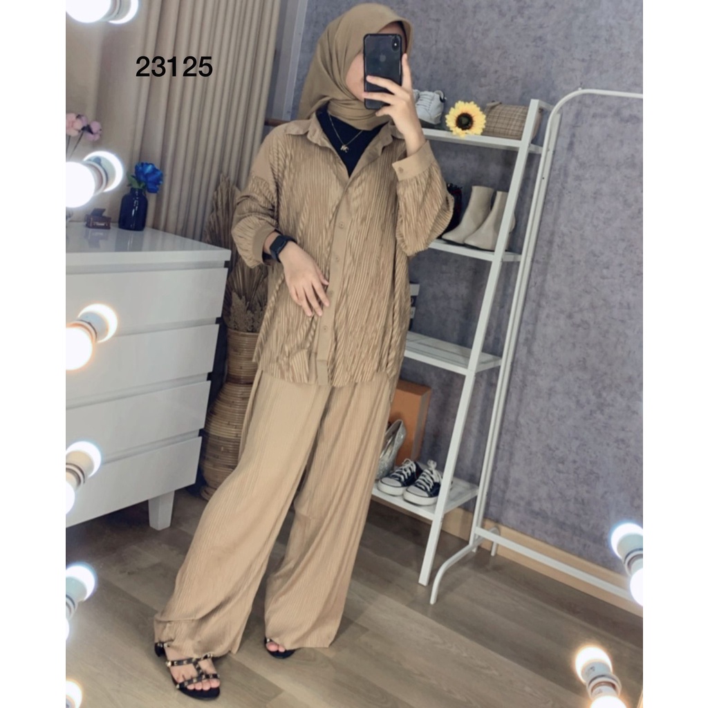 23125 ONE SET CELANA PJ KULOT PLISKET PLEADS ATASAN MODEL KEMEJA BELAH DEPAN OVERSIZED TANGAN 3/4 SETELAN PLISKET PLEADS CELANA KULOT SET BASIC WANITA PLISKET